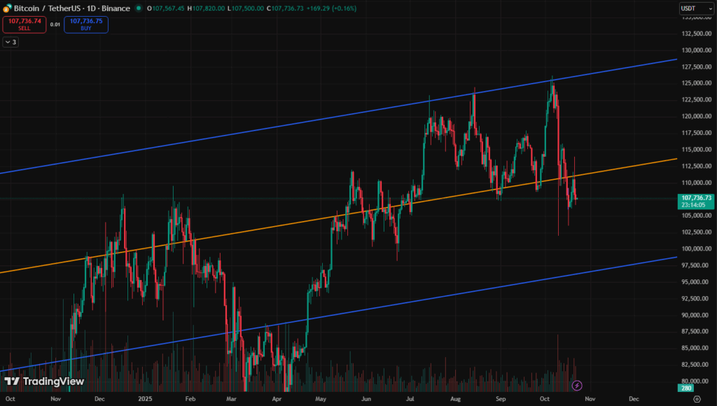 - Resistance: $111K (half-line) — reclaiming this would signal renewed bullish momentum.