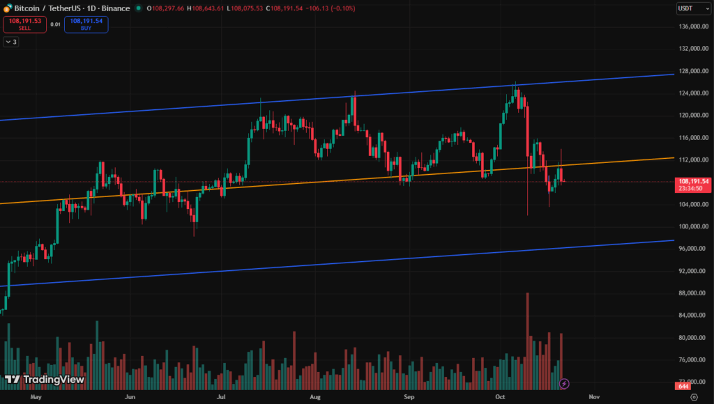 Bitcoin’s momentum has flipped sharply in the past 24 hours. After surging to $114K with strong accompanying volume, the market failed to hold the breakout and is now trading near $108K, having cleanly broken through its critical half-line support. This move marks a significant change in sentiment, as the market that once looked ready to reclaim higher ground now appears to be entering a phase of renewed downside pressure.