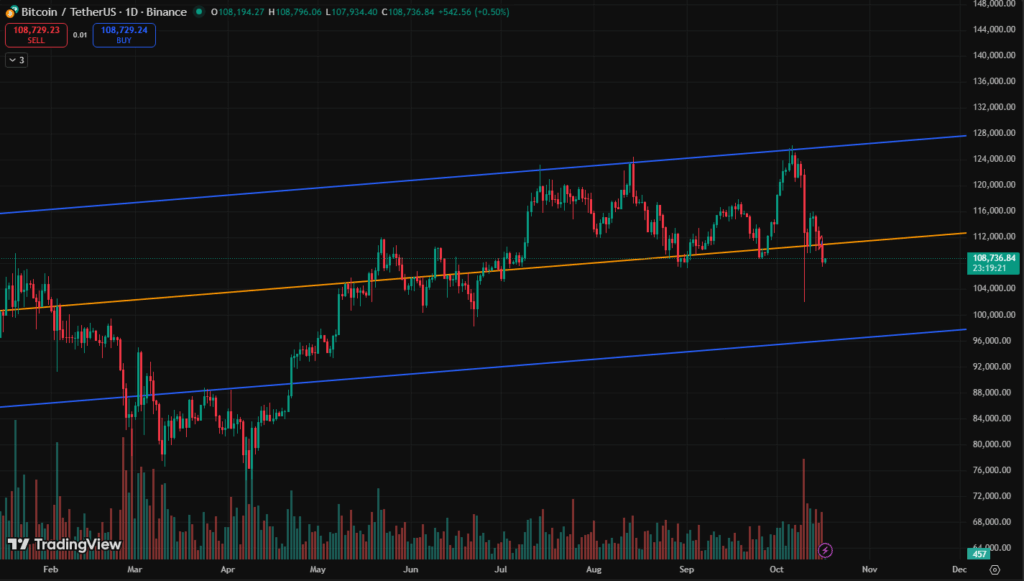 Bitcoin has finally broken through the key half-channel support at $110,000, plunging as low as $107,000. This level had served as a psychological floor for weeks, and its loss has triggered heightened volatility and renewed anxiety across the market.