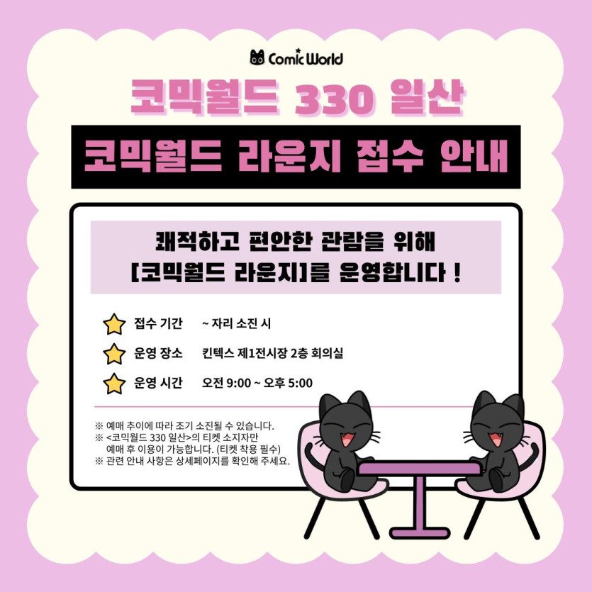 Due to restrictions on cosplay photography, seating, and baggage storage in the lobby area for smooth traffic flow, Comic World will operate a [Comic World Lounge] in the 2nd floor meeting rooms for participants who need long rest periods.